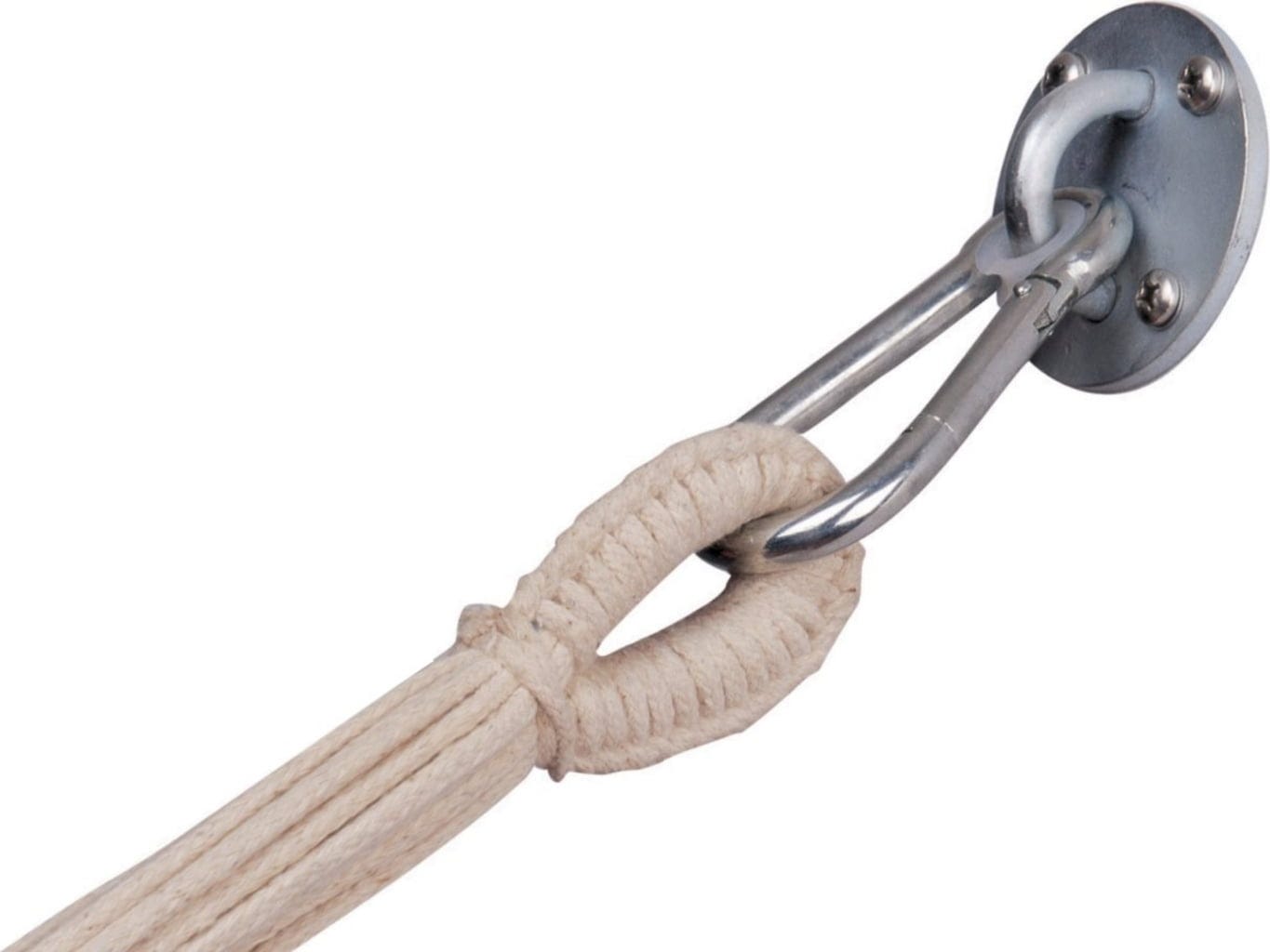 Pripevnenie hojdacej siete je veľmi jednoduché: na praktický karabínkový háčik ju zavesíte za okamih. Špeciálnym detailom je integrované plastové vedenie, ktoré vám umožní pohodlné a predovšetkým tiché hojdanie sa. Už žiadne nepríjemné zvuky! Dodatočnú bezpečnosť zabezpečuje šikovný nylonový krúžok, ktorý zabraňuje treniu kovu o kov, a tým zvyšuje životnosť.