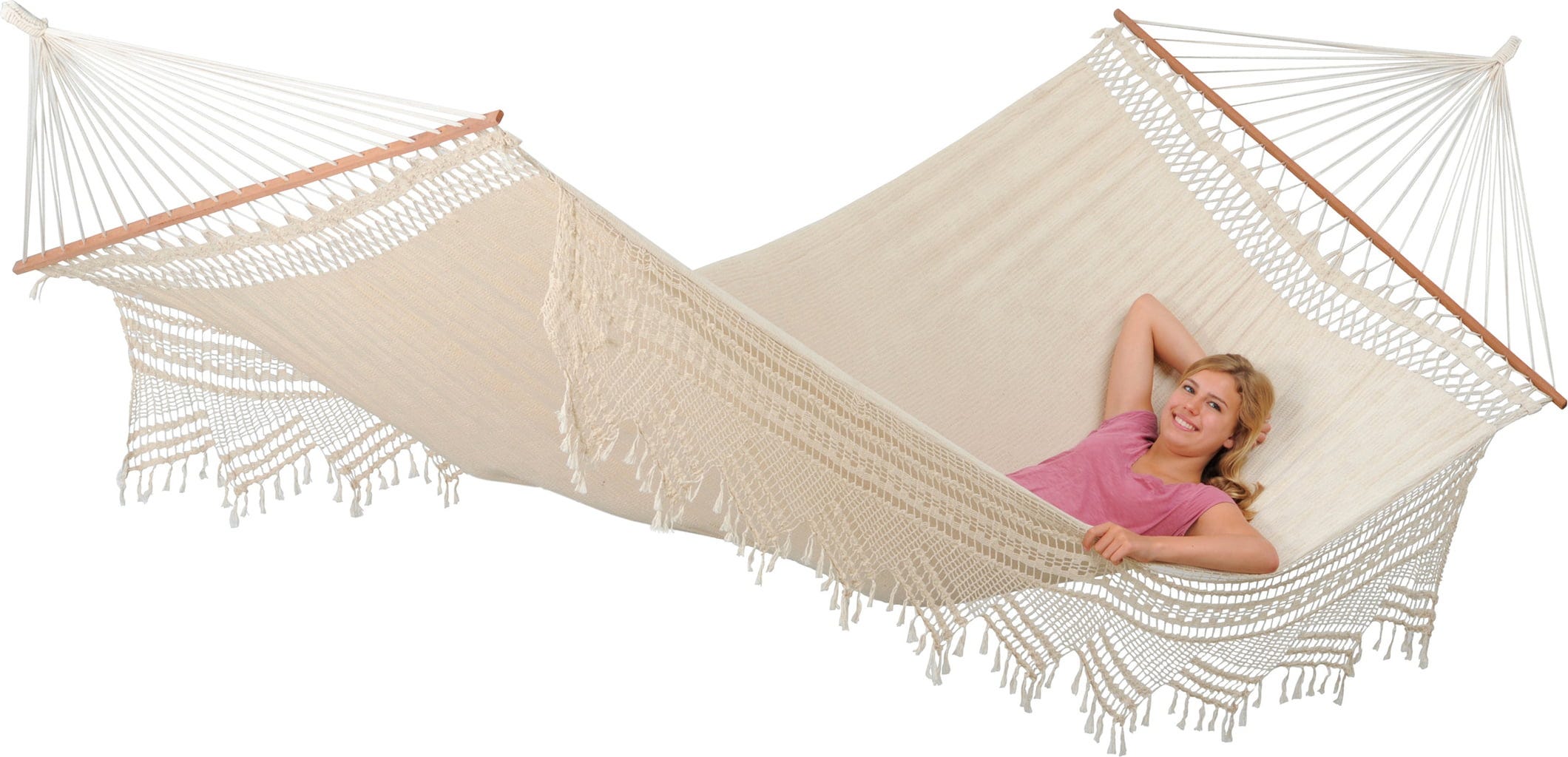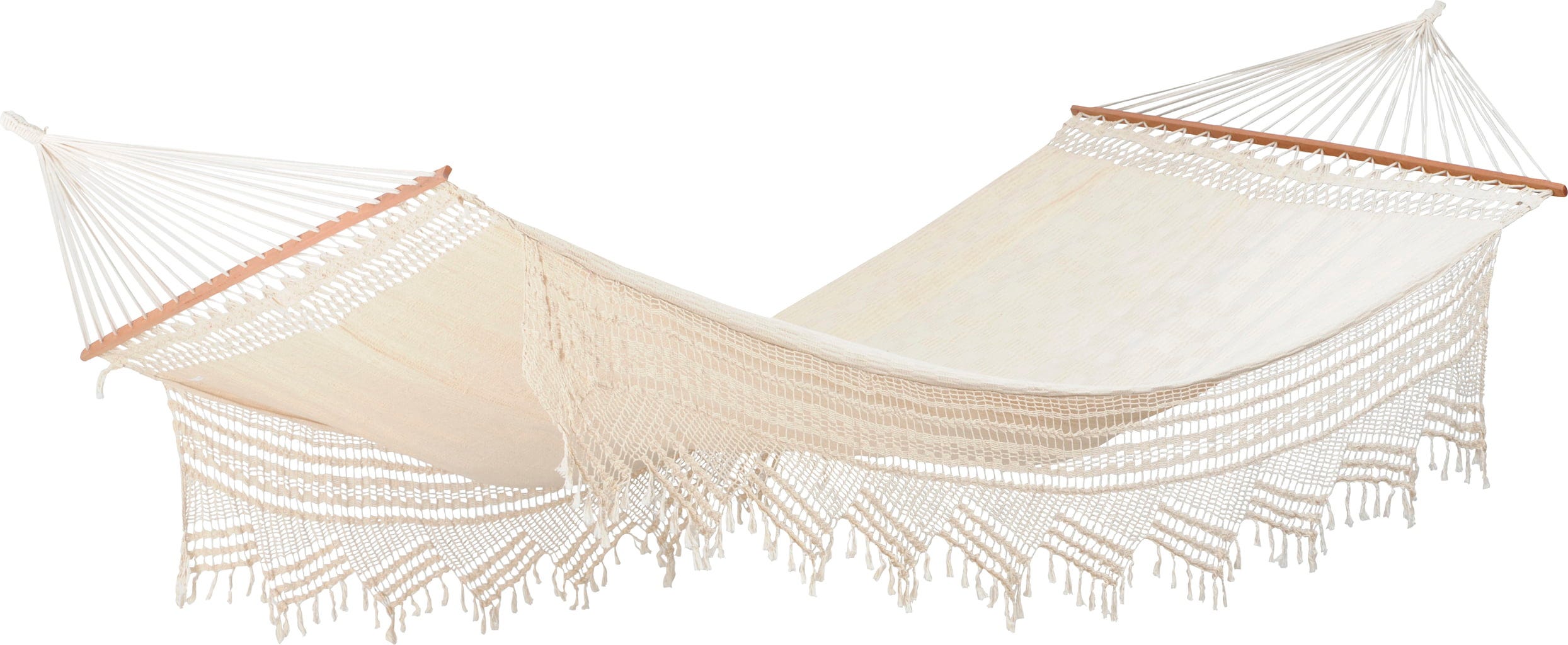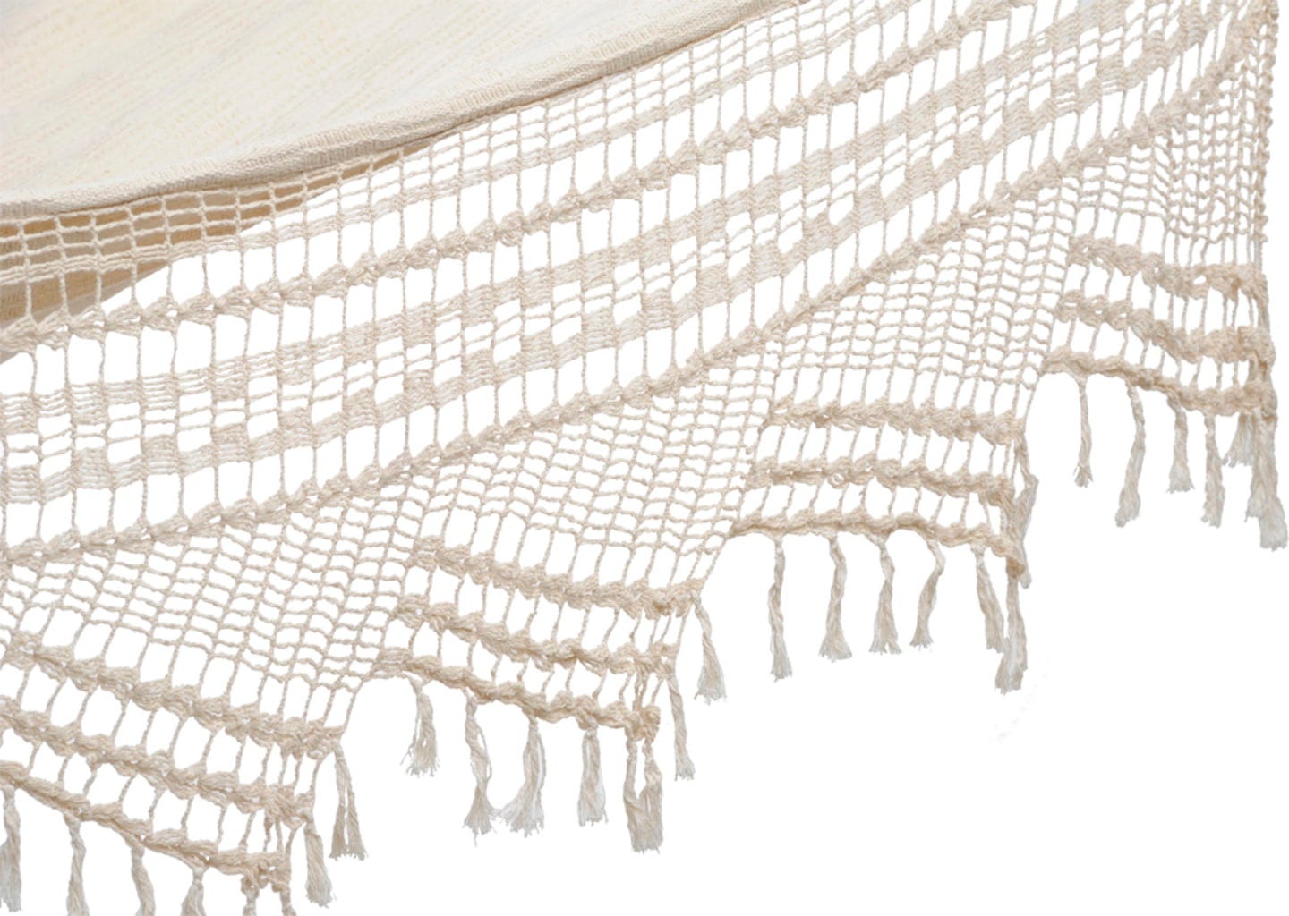Nádherný, ručne viazaný ozdobný okraj a ďalšie ručné makramé medzi látkou hojdacej siete a drevenými tyčami dodávajú hojdacej sieti krásny dizajn, zatiaľ čo jedinečná žakárová technika tkania zaručuje mimoriadne vysokú úroveň pohodlia. Stabilitu hojdacej sieti dodávajú pevné rozperné tyče z tvrdého dreva, zatiaľ čo hrubé šnúry, ktoré boli ručne spojené tkaným pásom, vyrovnávajú všetky namáhané miesta.