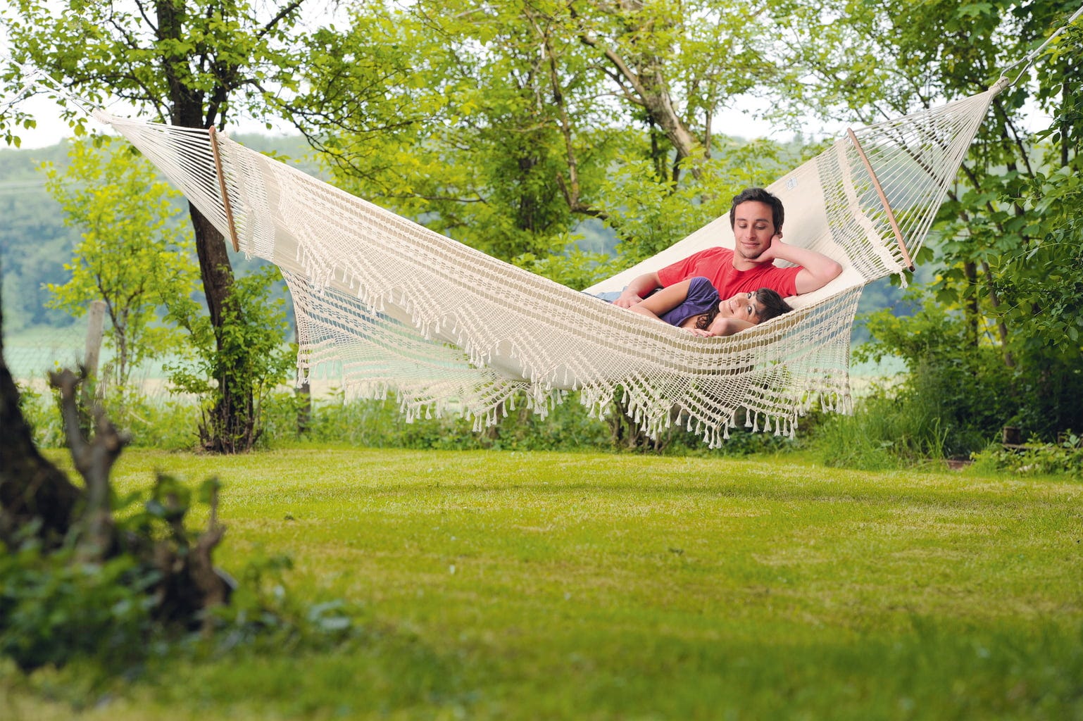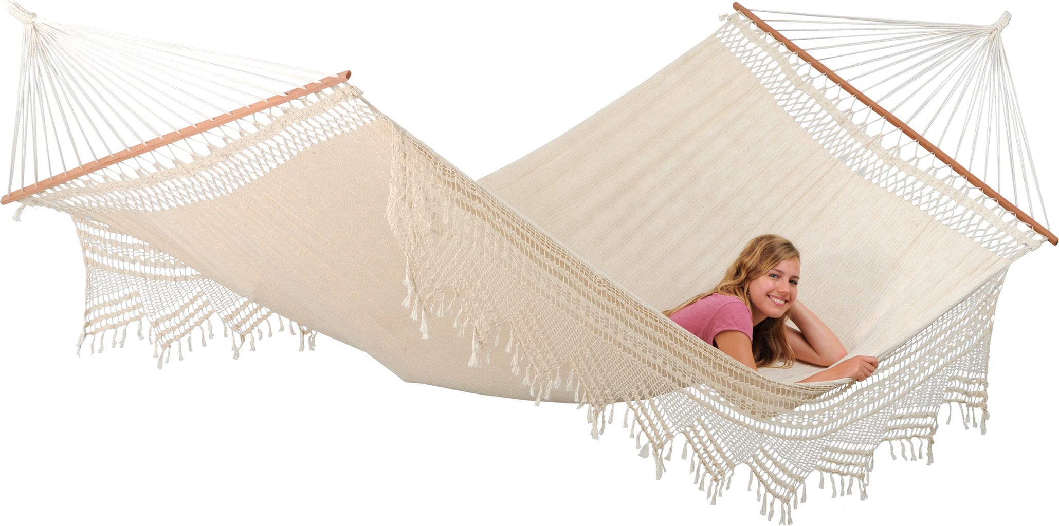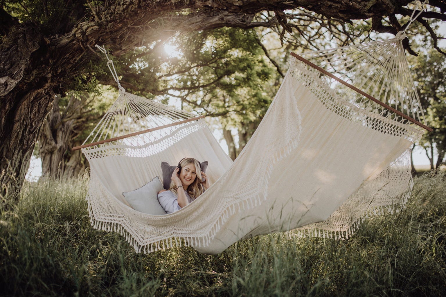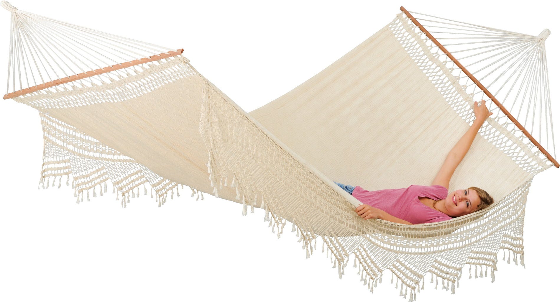 Nádherný, ručne viazaný ozdobný okraj a ďalšie ručné makramé medzi látkou hojdacej siete a drevenými tyčami dodávajú hojdacej sieti krásny dizajn, zatiaľ čo jedinečná žakárová technika tkania zaručuje mimoriadne vysokú úroveň pohodlia. Stabilitu hojdacej sieti dodávajú pevné rozperné tyče z tvrdého dreva, zatiaľ čo hrubé šnúry, ktoré boli ručne spojené tkaným pásom, vyrovnávajú všetky namáhané miesta.