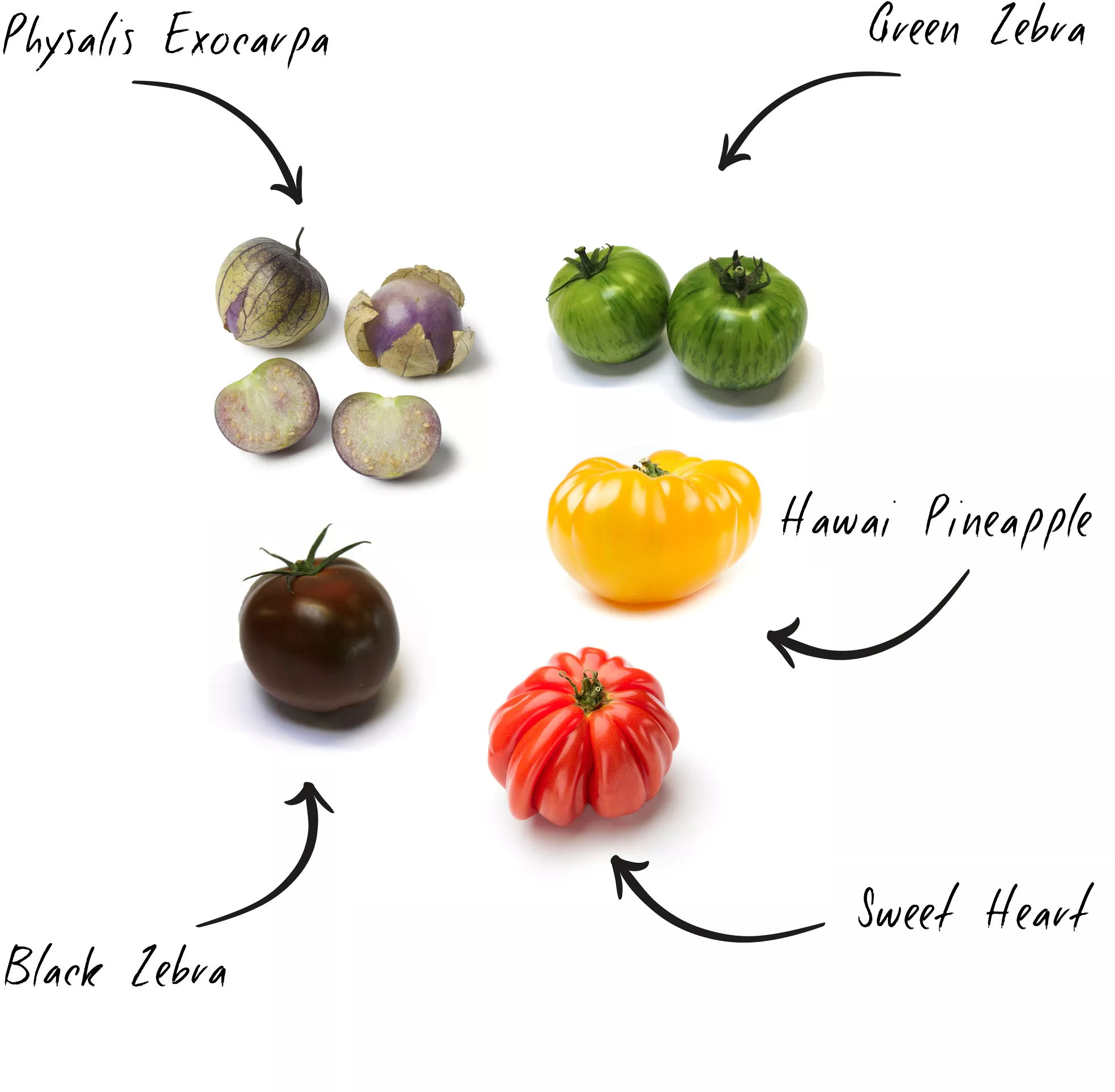 - 5 druhov bio semien: Schwarzes Zebra, Grünes Zebra, Hawaiianische Ananas, Rinderherz, Physalis Ixocarpa