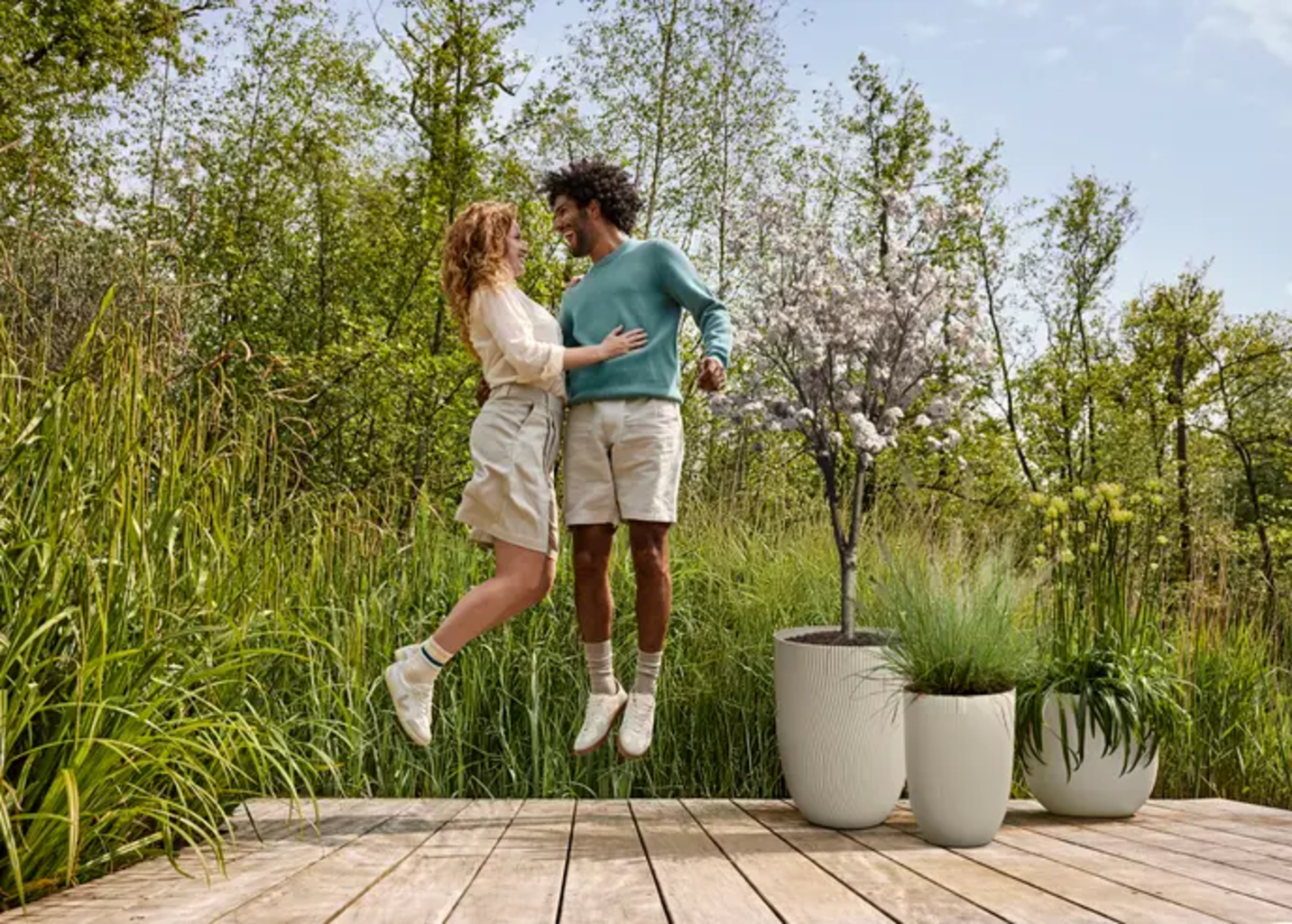 Organický povrch vytvára pokojnú, prirodzenú atmosféru. Kvetináč je odolný voči poveternostným vplyvom, farebne stály a vyrobený zo 100 % recyklovaného plastu - udržateľne vyrábaného pomocou veternej energie.