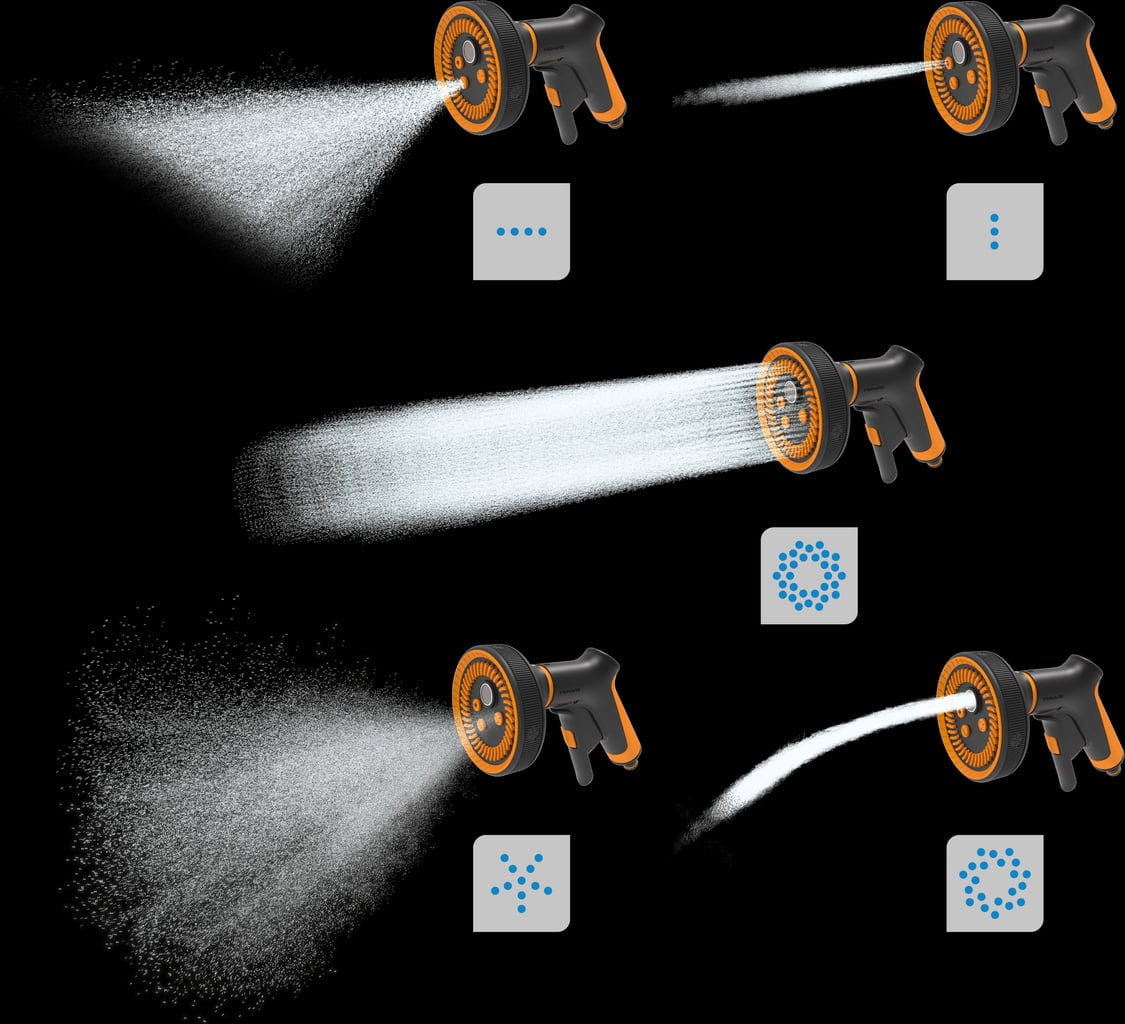 Táto striekacia pištoľ s vymeniteľnou hlavicou SoftGrip™ zaujme svojou všestrannosťou! Či už potrebujete jemnú hmlu, silný postrek, cielený plochý prúd, dôkladné opláchnutie alebo koncentrovaný prúd - tryska sa prispôsobí vašim potrebám jediným otočením!