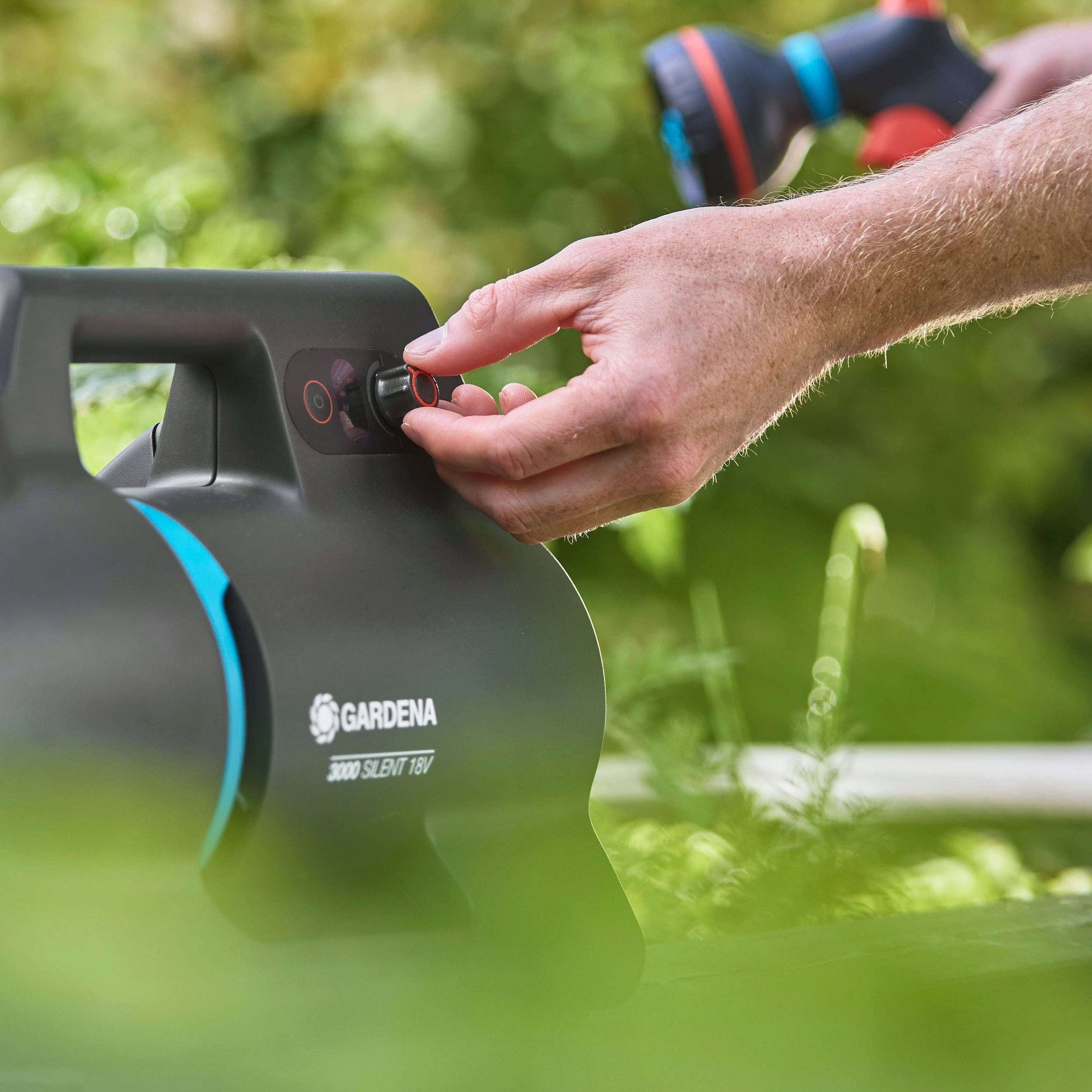 18V akumulátorové záhradné čerpadlo P4A od spoločnosti GARDENA s tlakom 3,0 bar poskytuje dostatočný tlak na zavlažovanie zo studní, cisterien alebo sudov na dážď. Vďaka inovatívnej technológii Silent pracuje ticho ako šepot - na vzdialenosť 10 metrov je sotva hlasnejšie ako moderná chladnička.