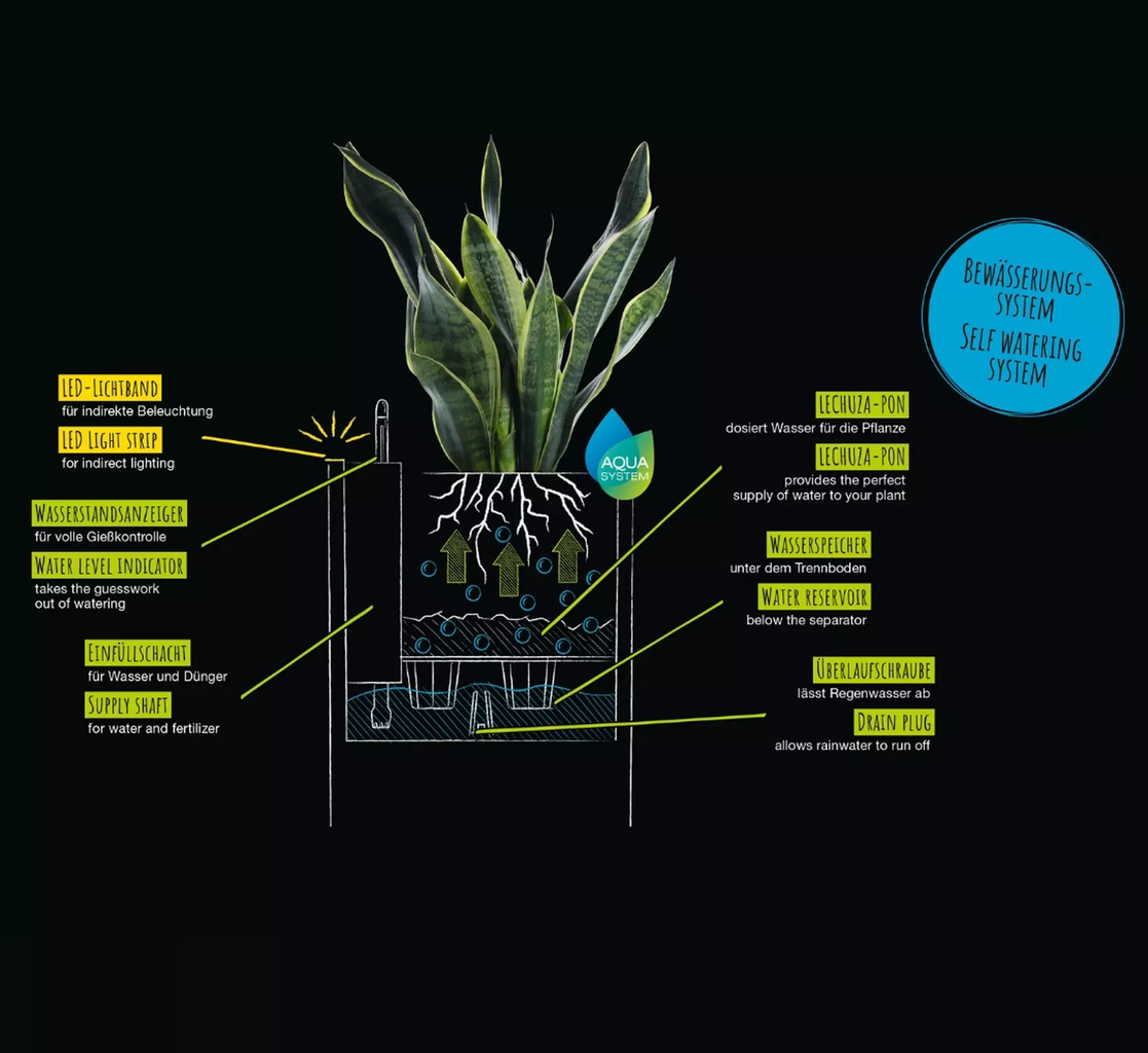 - Integrovaný originálny zavlažovací systém LECHUZA poskytuje rastlinám optimálne zavlažovanie.