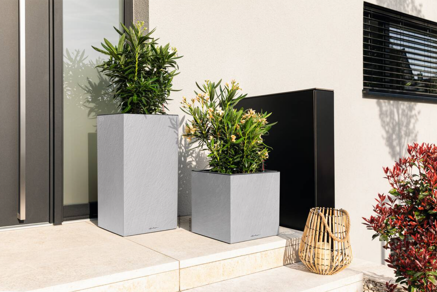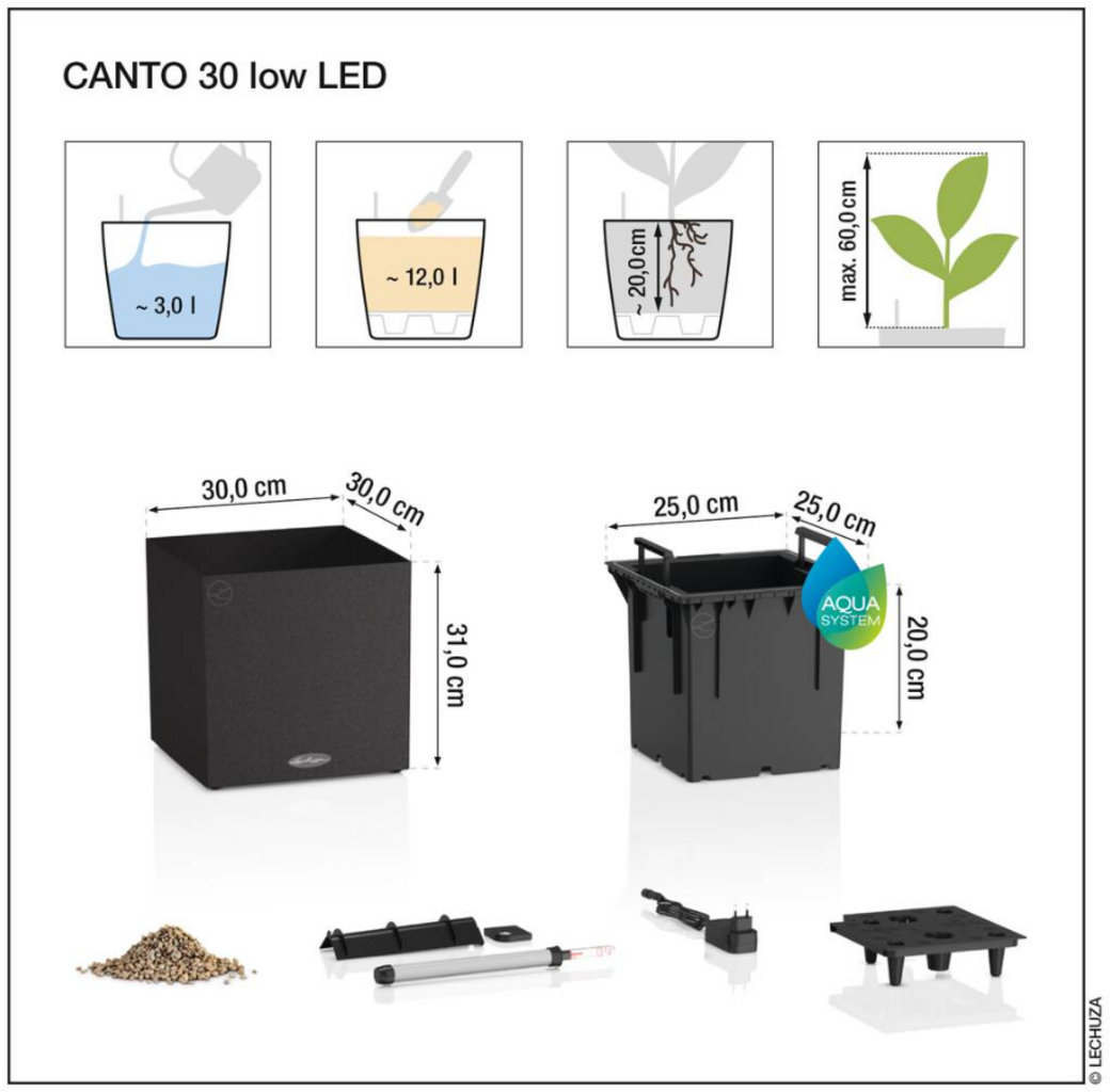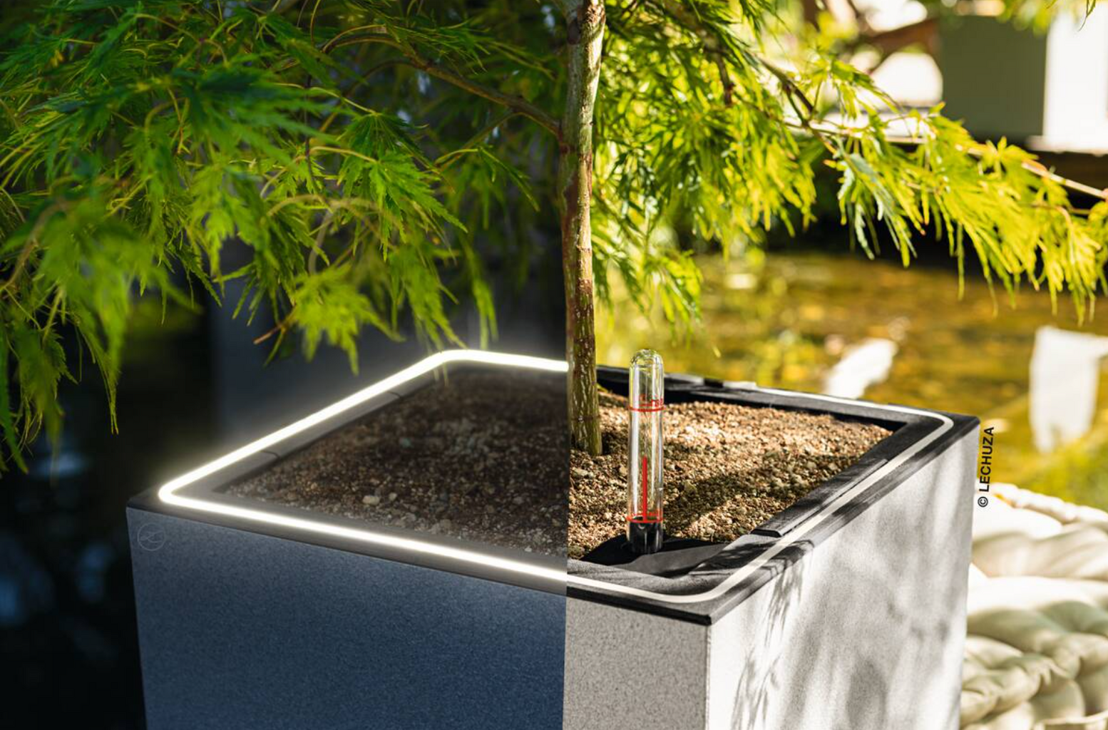 Dômyselne integrovaný LED pásik osvetľuje rastliny zospodu a vytvára fascinujúcu atmosféru - či už na terase, balkóne alebo v obývačke. Systém zavlažovania LECHUZA a vyberateľná vložka na rastliny poskytujú dodatočné pohodlie.