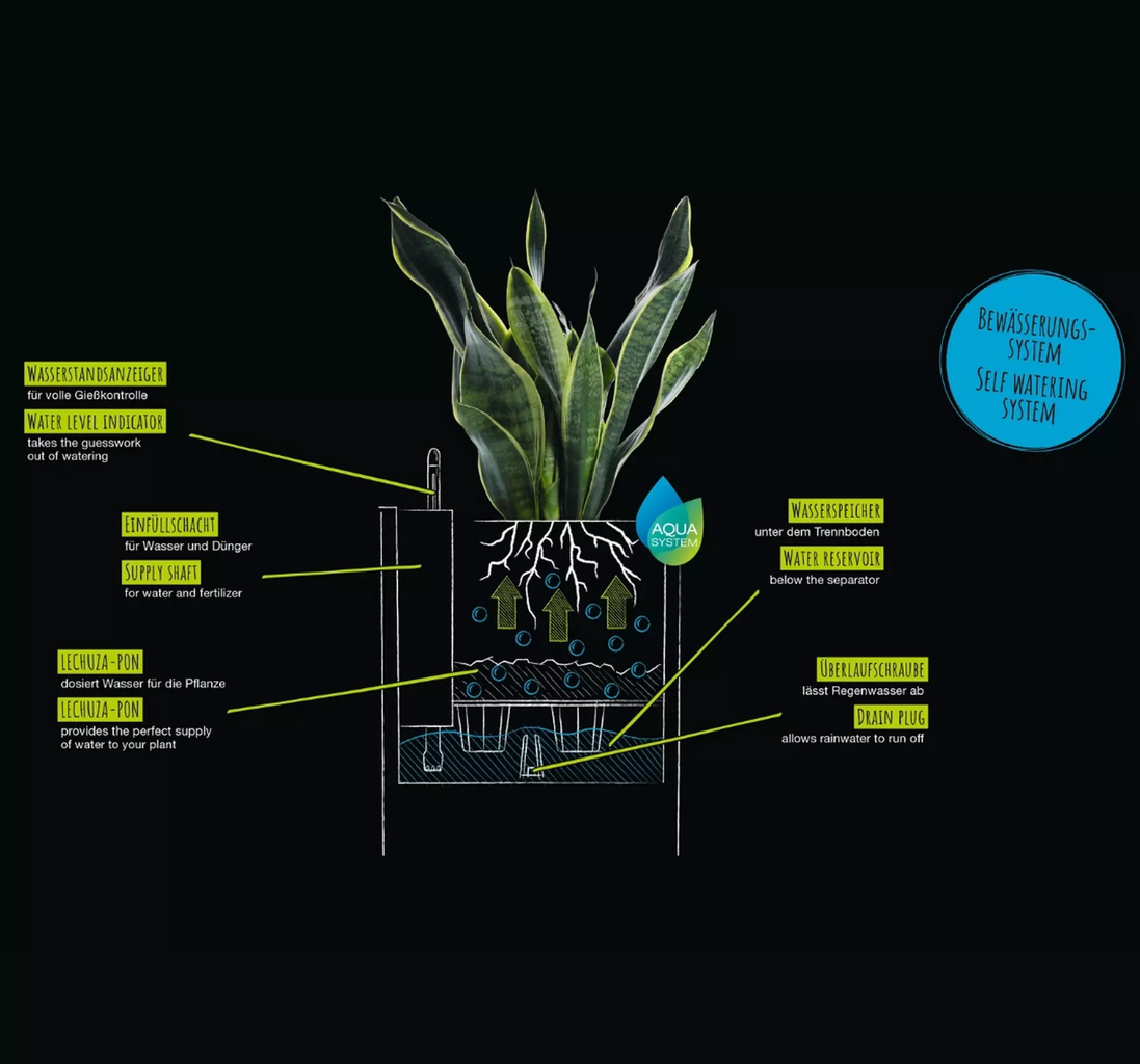 - Integrovaný originálny zavlažovací systém LECHUZA poskytuje rastlinám optimálny prísun vody.