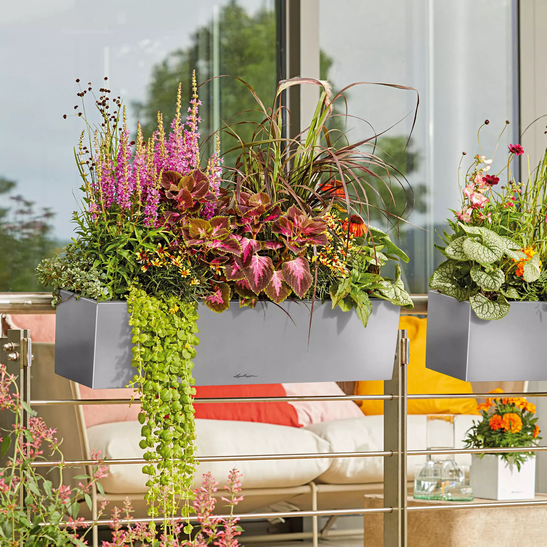 Balkonový kvetináč "Balconera Steel" z nehrdzavejúcej ocele inšpirovaný priemyselným štýlom ponúka dostatok priestoru na pestrú výstavu kvetov. Jeho dômyselný systém "všetko v jednom" s odnímateľnými kvetináčmi a zavlažovacím systémom robí z tohto kvetináča absolútneho favorita balkónovej sezóny.