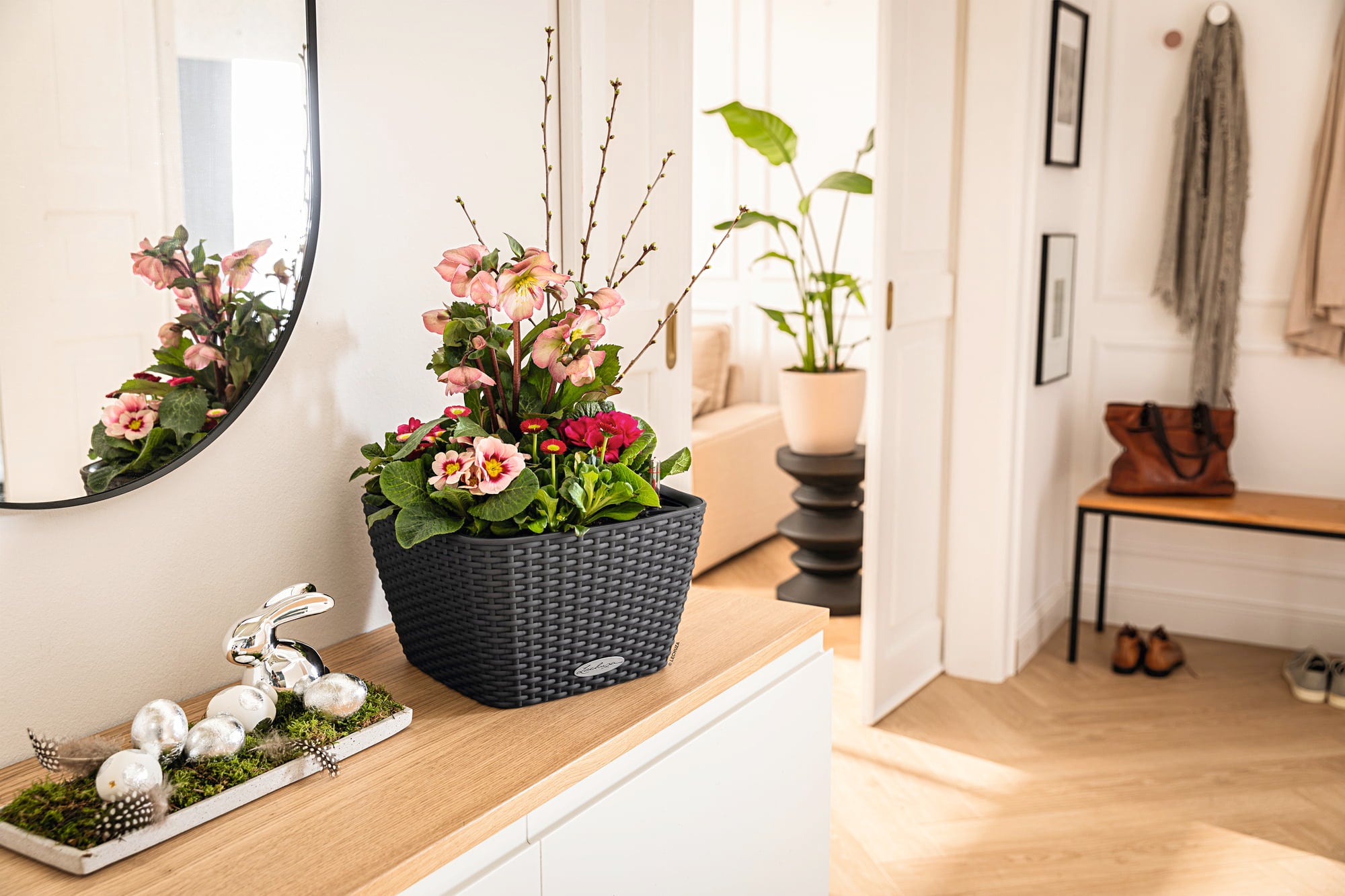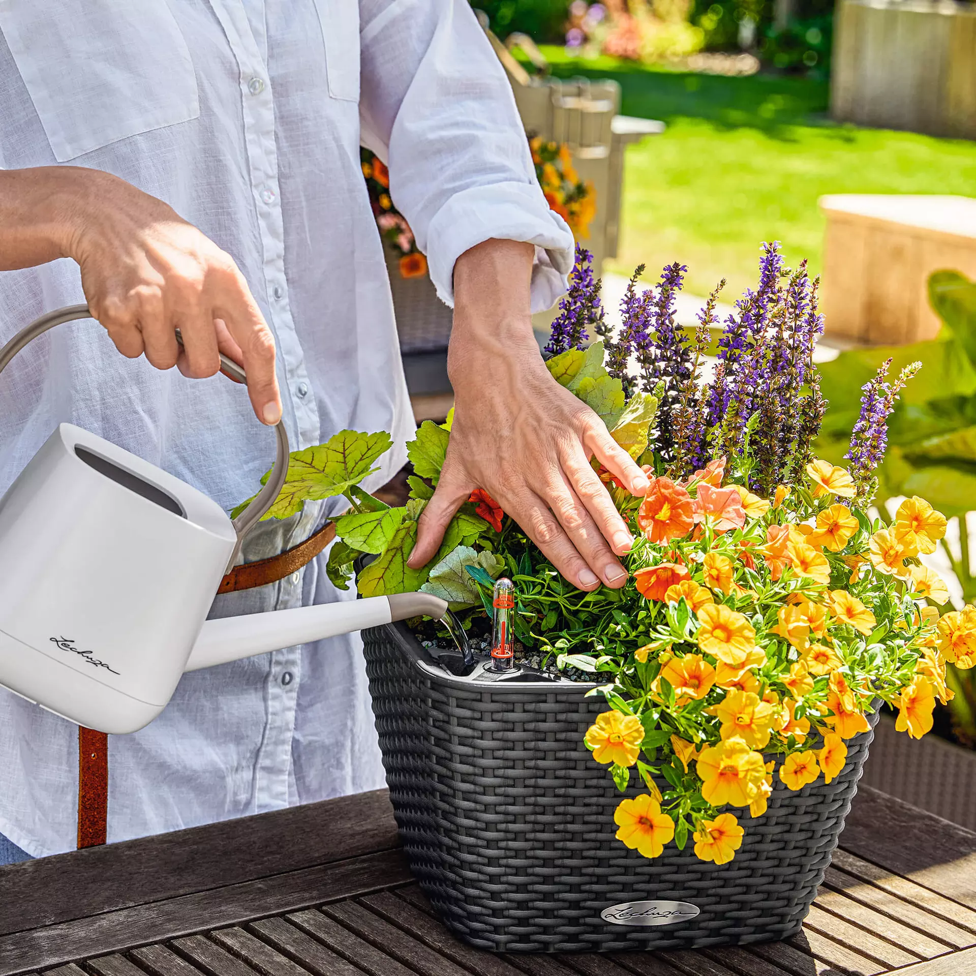 Kvetináč BACINO z kolekcie Cottage so svojím štvorcovým povrchom a ideálnou výškou 18 cm je skutočne všestranným pomocníkom na balkónoch a terasách. Či už pri stole, na podlahe alebo na schodisku. Vďaka patentovanému systému zavlažovania Lechuza majú rastliny vždy ideálne množstvo vody.