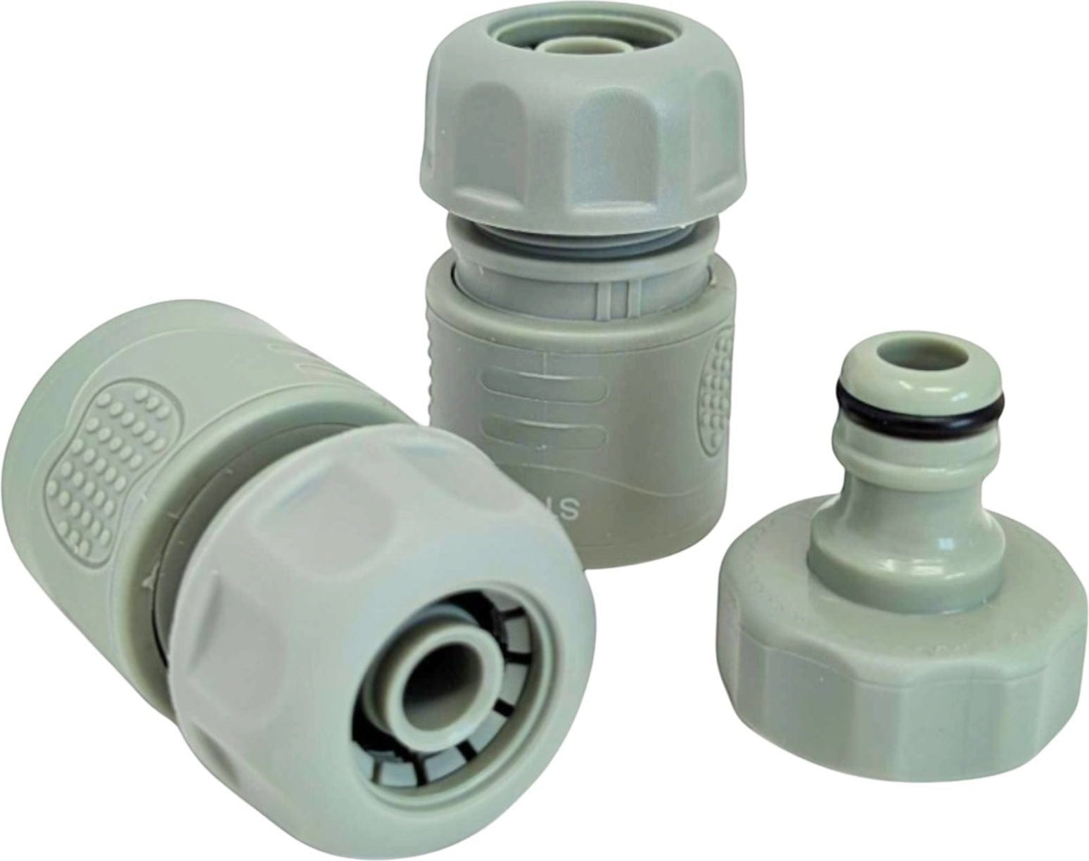 - 3-dielna sada pozostáva z 1/2 palcovej hadicovej prípojky, prípojky na vodovodný kohútik G 26,5 mm (3/4 palca) a 1/2 palcovej zátky water stop