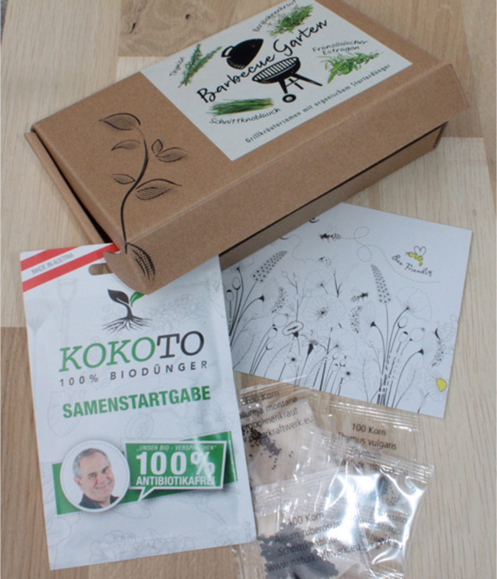 V boxe sa nachádzajú 4 rôzne druhy byliniek, 10 g organického štartovacieho hnojiva od Kokoto a pohľadnica na vymaľovanie (vytlačená na 100 % recyklovanom kartóne).