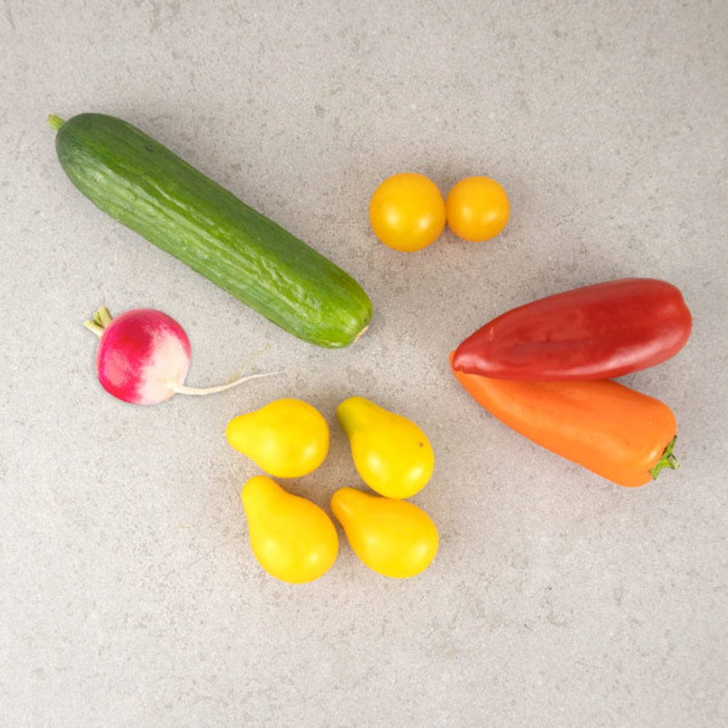 10 g bio hnojiva od Kokoto, 10 semien balkónovej papriky, 4 semená snack uhorky, 20 semien žltej hruškovitej paradajky, 600 semien reďkovky a pohľadnica na vymaľovanie (vytlačená na 100 % recyklovanom kartóne).