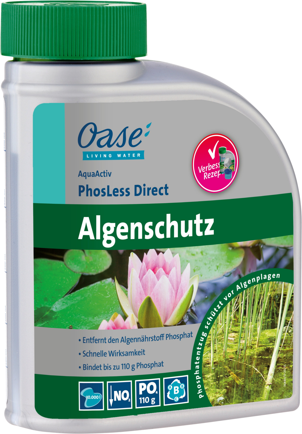 Nadbytok fosfátov urýchľuje rast rias. S prípravkom PhosLess Direct ponúka spoločnosť Oase ochranu proti riasam, ktorá účinne spomaľuje nežiaduci rast rias. Prípravok viaže nielen fosfát ale aj sírovodík - príčinu nepríjemného zápachu.