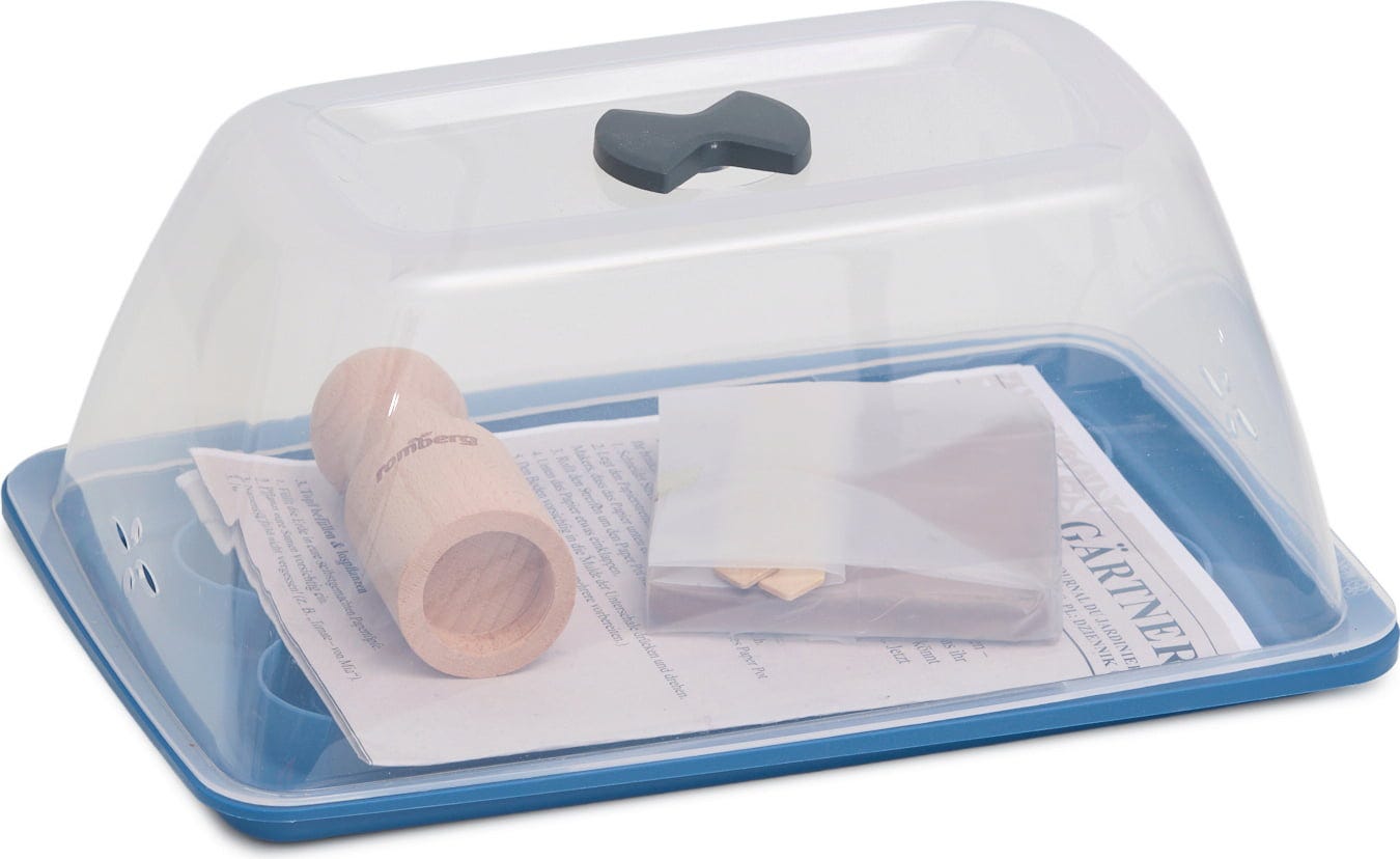 Obsah: výsevná miska, drevená pečiatka, návod (v nemeckom jazyku) a príslušenstvo pre prvé výsevy