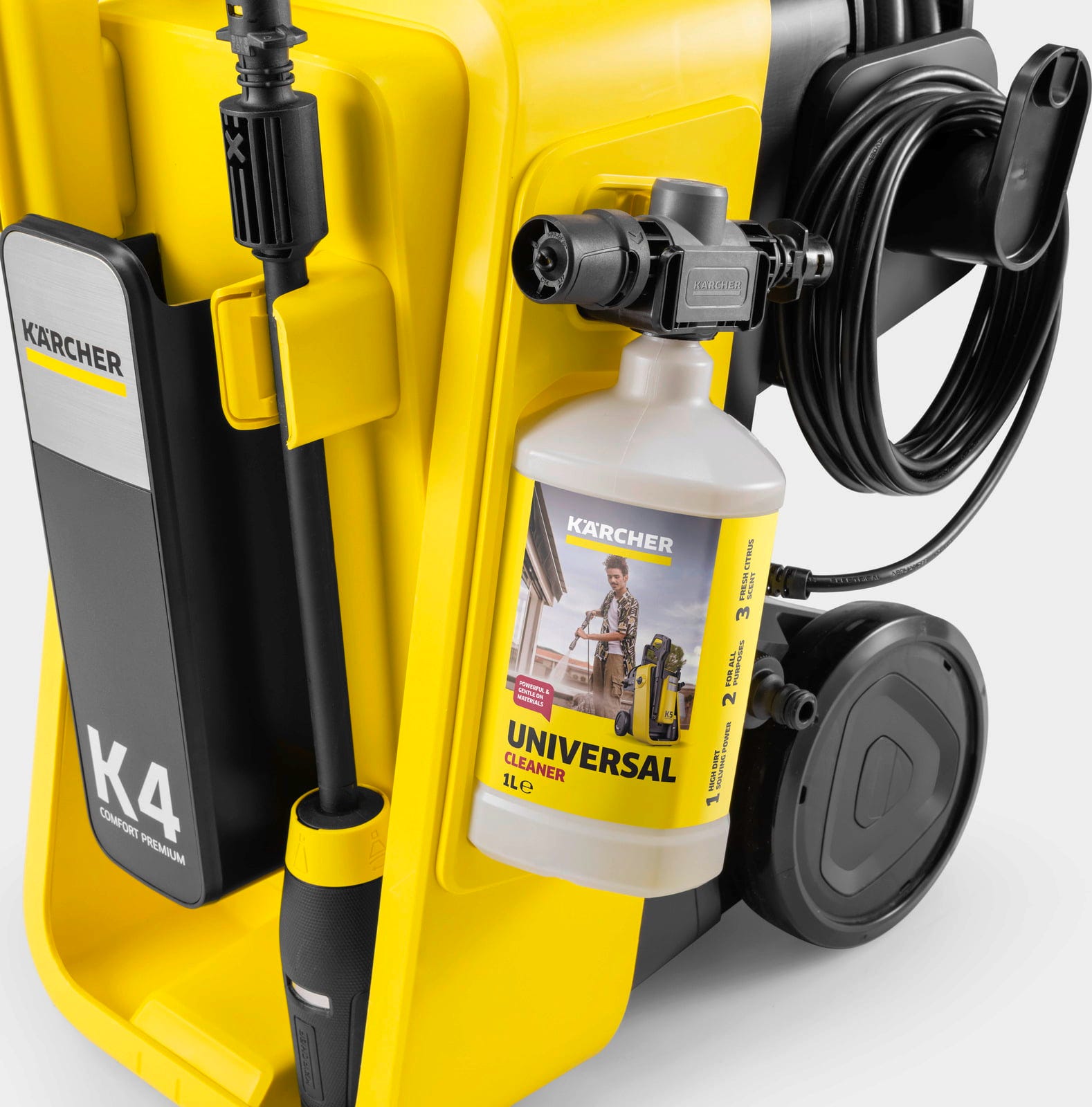 S prietokom až 420 l/h dôkladne vyčistí aj príjazdové cesty, ploty alebo menšie plochy fasád. Multifunkčná tryska 4 v 1 umožňuje rýchle prepínanie medzi rôznymi typmi prúdu pomocou otočného pohybu. Vďaka systému Quick Connect je pripojenie hadice mimoriadne jednoduché. Premyslené riešenie skladovania a výsuvná teleskopická rukoväť poskytujú ďalšie pohodlie pri preprave a skladovaní.