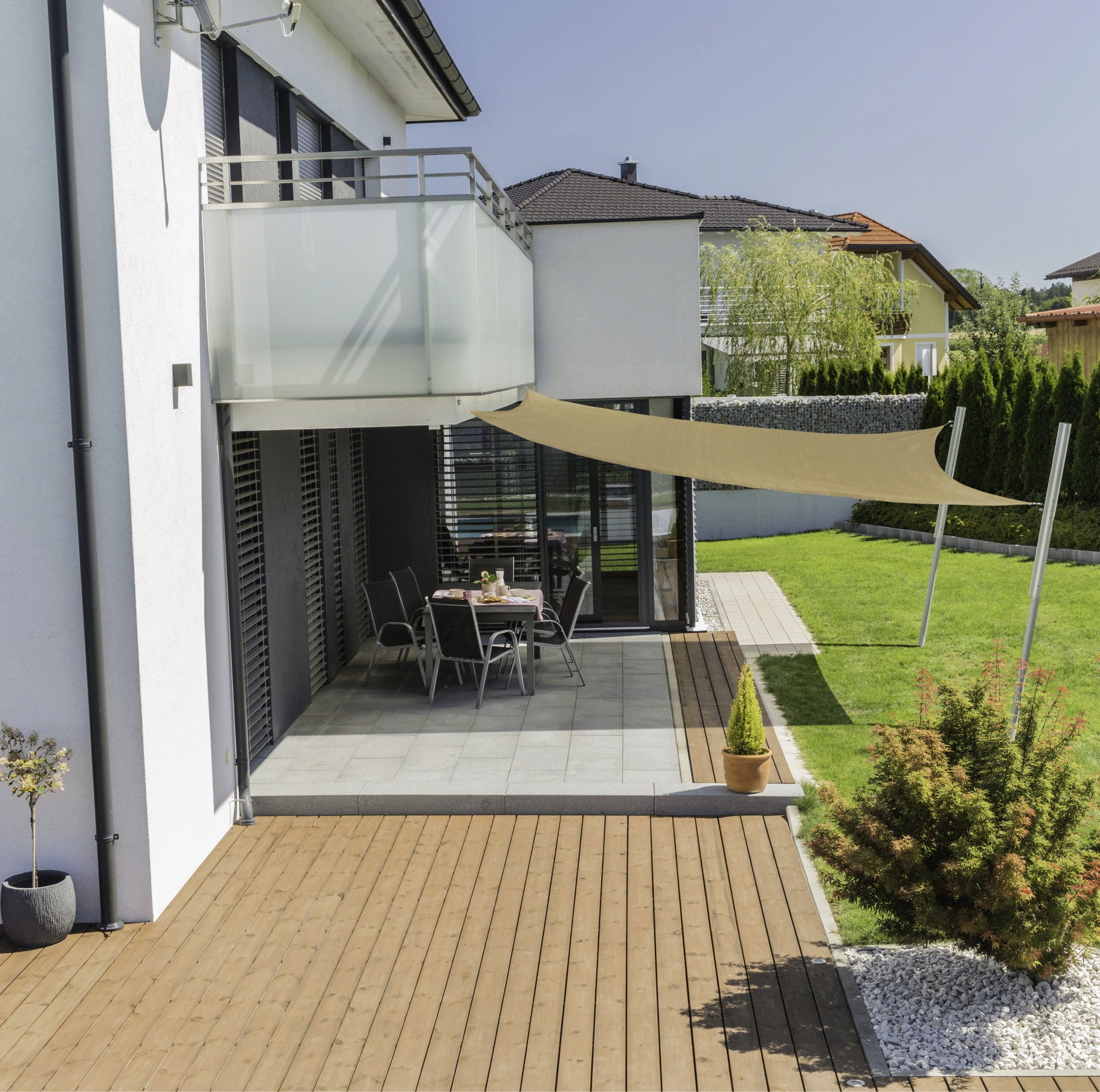 Štvorcová tieniaca plachta sa ideálne hodí na zatienenie záhrady, terasy alebo balkóna. Počas horúcich dní je tiež skvelá nad bazénom alebo pieskoviskom.